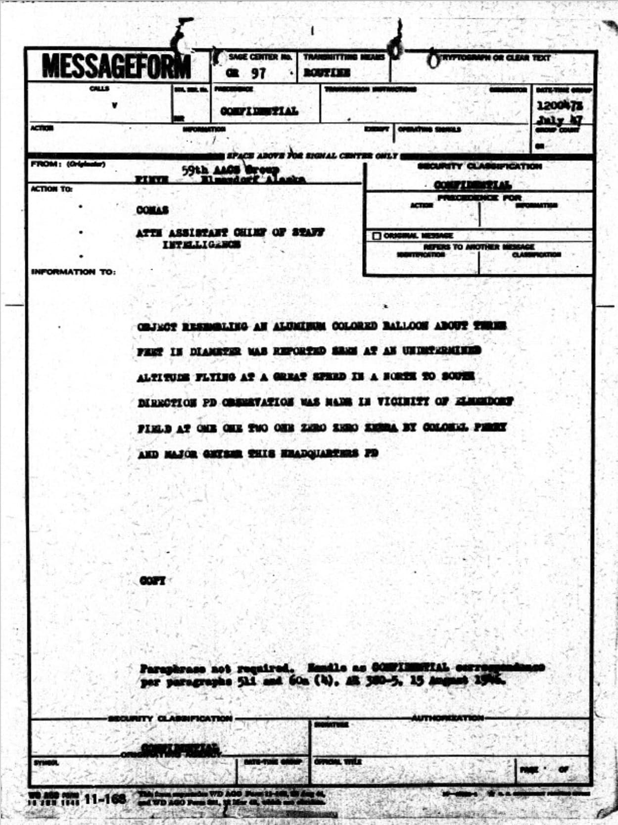 11:00 a.m. USAAF Col. Bruce H. Perry and Maj. William E. Geyser, 59th AACS Group, see a round 2–3 foot or 10-foot aluminum or silver metallic sphere traveling at great speed to the south of Elmendorf AFB [now Joint Base Elmendorf-Richardson], Anchorage, Alaska. Estimated altitude is 3,000–4,000 feet. [Eberhart]