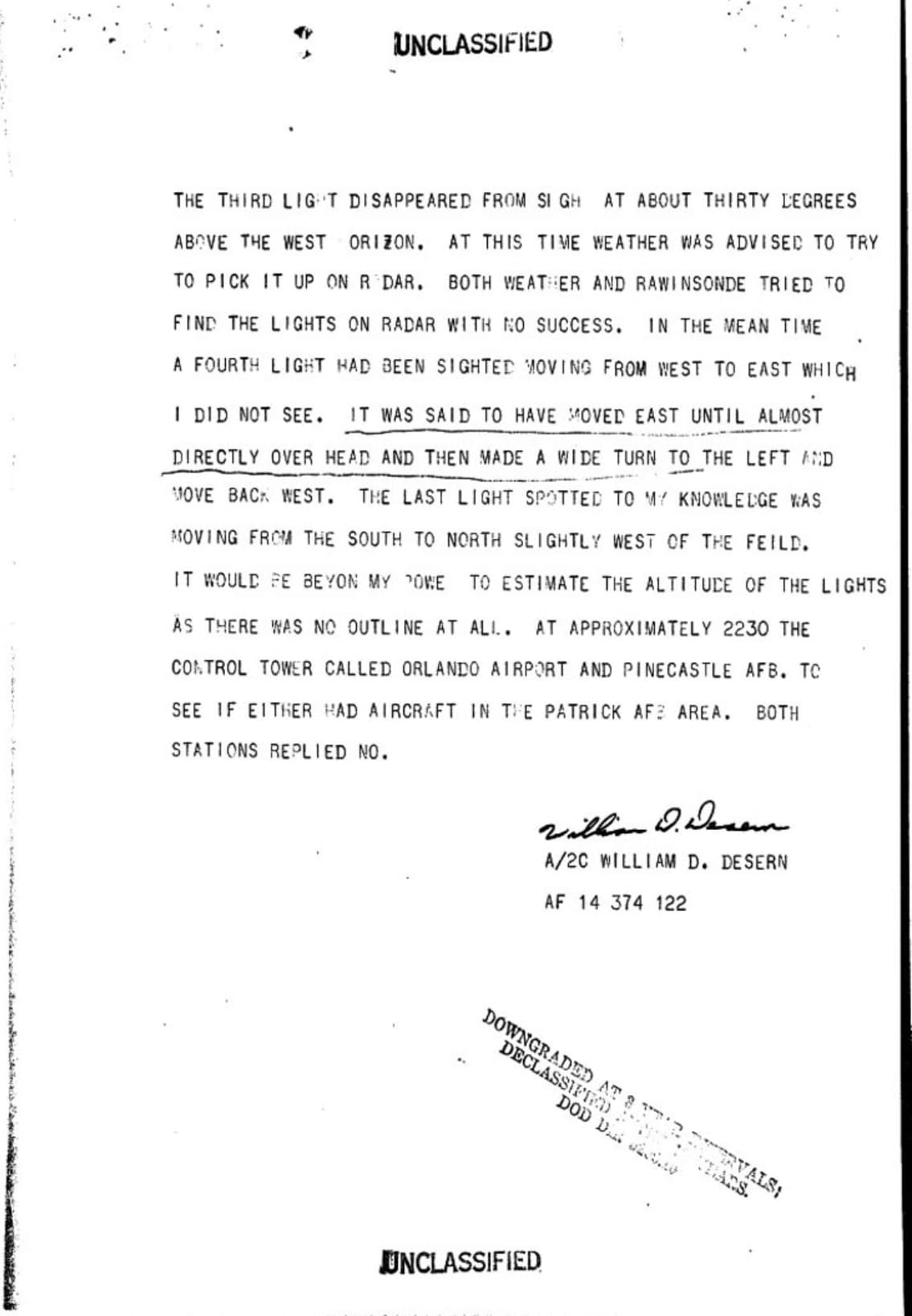 9:45 p.m. Three Air Force officers and four enlisted men at Patrick AFB, near Cocoa Beach, Florida, see a series of hovering and maneuvering red-orange lights moving in a variety of directions. [Eberhart]