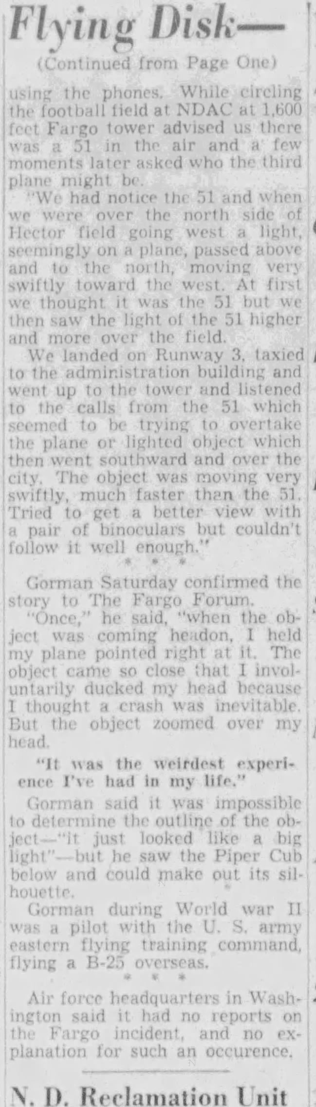 “Fargo Pilot Tells of Chasing ‘Flying Disk,’” Fargo (N.Dak.) Forum, October 3, 1948, pp. 1–2;
